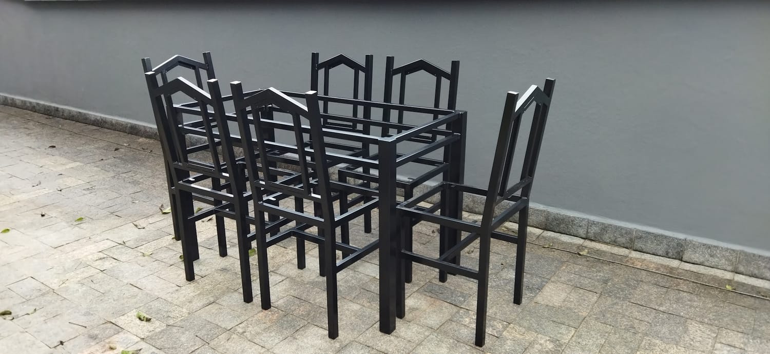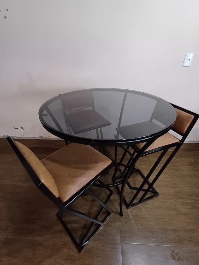 Mesa industrial de alto padrão com 3 banquetas.